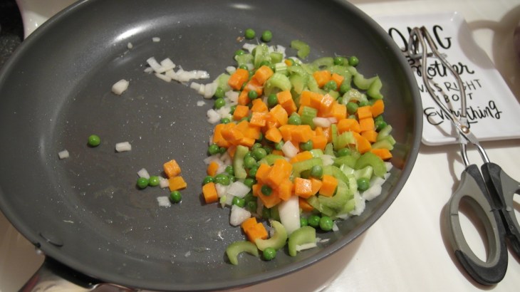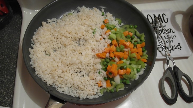- While those veggies cook get your cooked rice out. Try to separate it as much as possible. I use California Sushi Rice, which is quite sticky. It might take a bit of poking and prodding. Don’t forget about your onions, garlic, and celery; make sure to toss them around a bit in the pan. Throw that rice in the pan now.