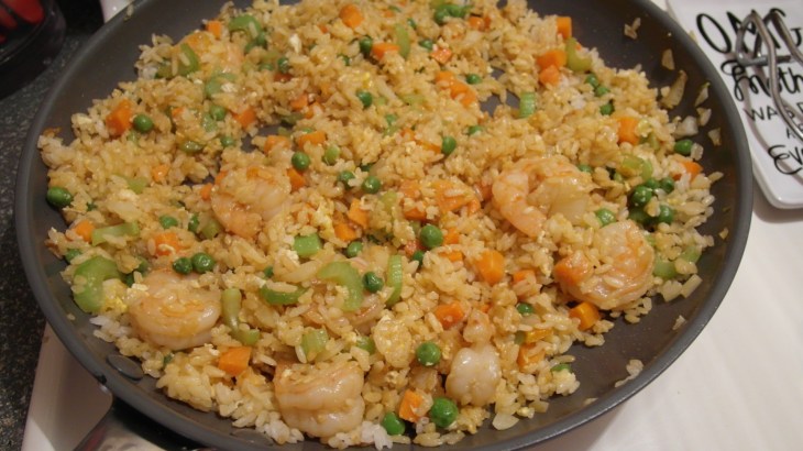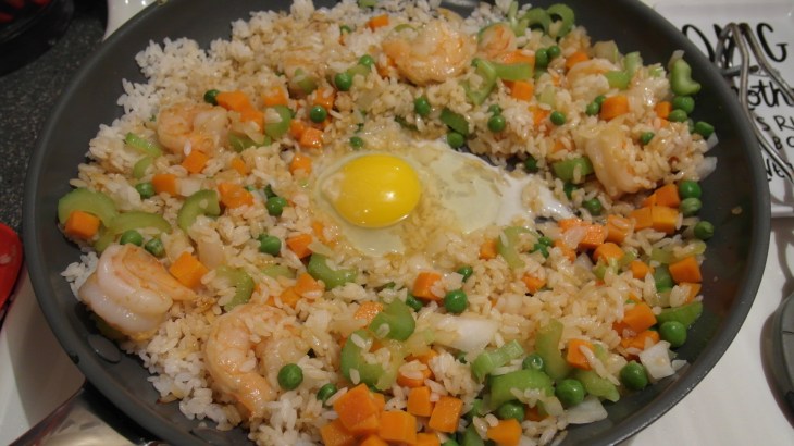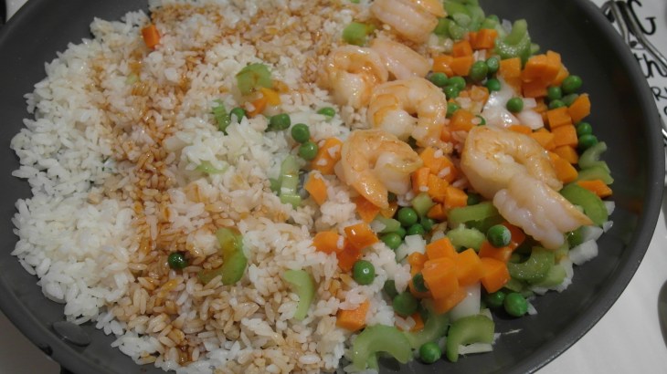 - Stir fry the rice around the pan for a few minutes. Add the frozen peas, carrots, and the cooked shrimp. Add the soy sauce and sesame oil. Crack an egg into that mess of goodness you have going and scramble it around. Let that go a couple minutes and you have your very own fried rice.