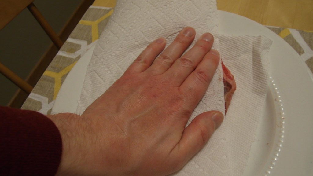 - Take your steak out of the package and dab it dry with a paper towel. You need to get rid of the excess moisture in the steak. Feel free to give it a good smoosh with your hands. Don’t destroy the thing, just don’t let it off easy.