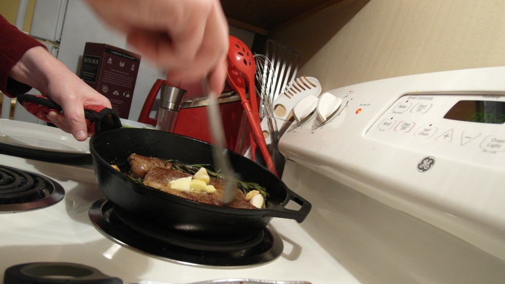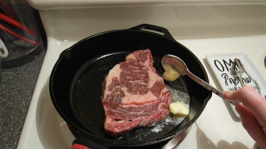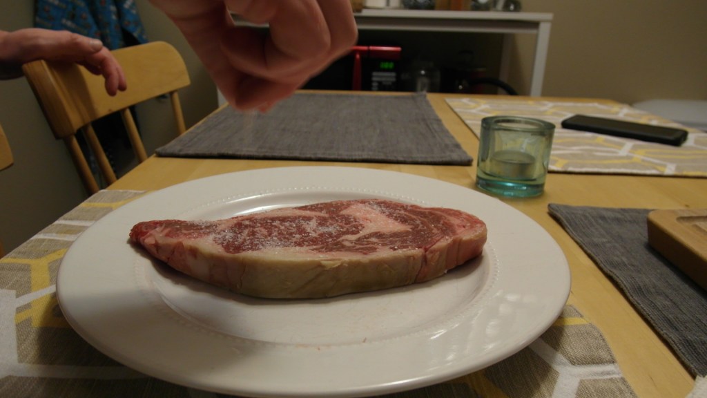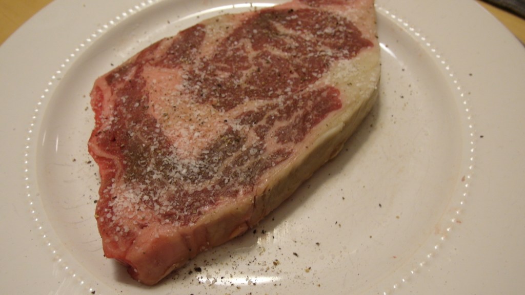 In terms of ingredients, we don’t need much here. A steak, whatever cut you want. Mine was a boneless rib eye I got from the co-op. In my experience, its best to look for ones with some marbling and fart. Did I just write fart? I meant fat. I am leaving that typo there. Don’t fart on your steak. This one was quite thin and cooked a little fast. I have learned that a thicker steak is easier to avoid over cooking. You can always ask the butcher for a thicker cut steak. Yes, even a super market butcher will do this.