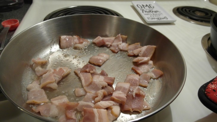 - Chop your bacon into whatever size you like. You can see mine about are about a half inch. That ensures the bacon will not crisp up too much while cooking. You are free to do what you like, I prefer a medium cooked bacon. Also, don’t cheap out on your bacon!