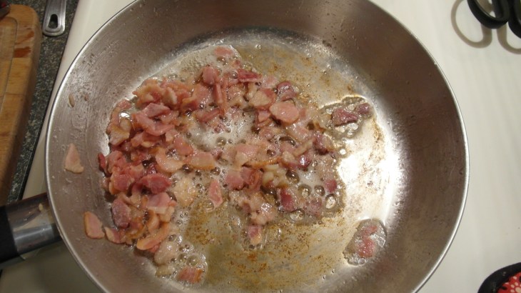 - Throw your bacon onto a skillet and start cooking. Cook it to your desired doneness. Eat a little piece while cooking it. Bacon is good.