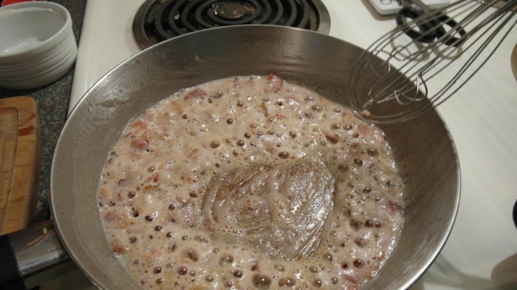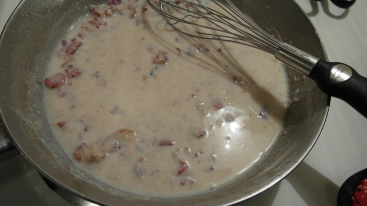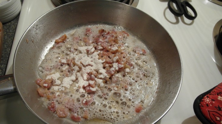 - By this time you should have a nice amount of grease. Guess what? Keep it in there. Add the flour to the skillet and begin to whisk it. You will notice it’s going to start clumping up. Keep stirring. You need to cook the flour for about two minutes. If you don’t cook it long enough your bacon will taste like raw flour. When it starts to spit and bubble you are ready for the next step.